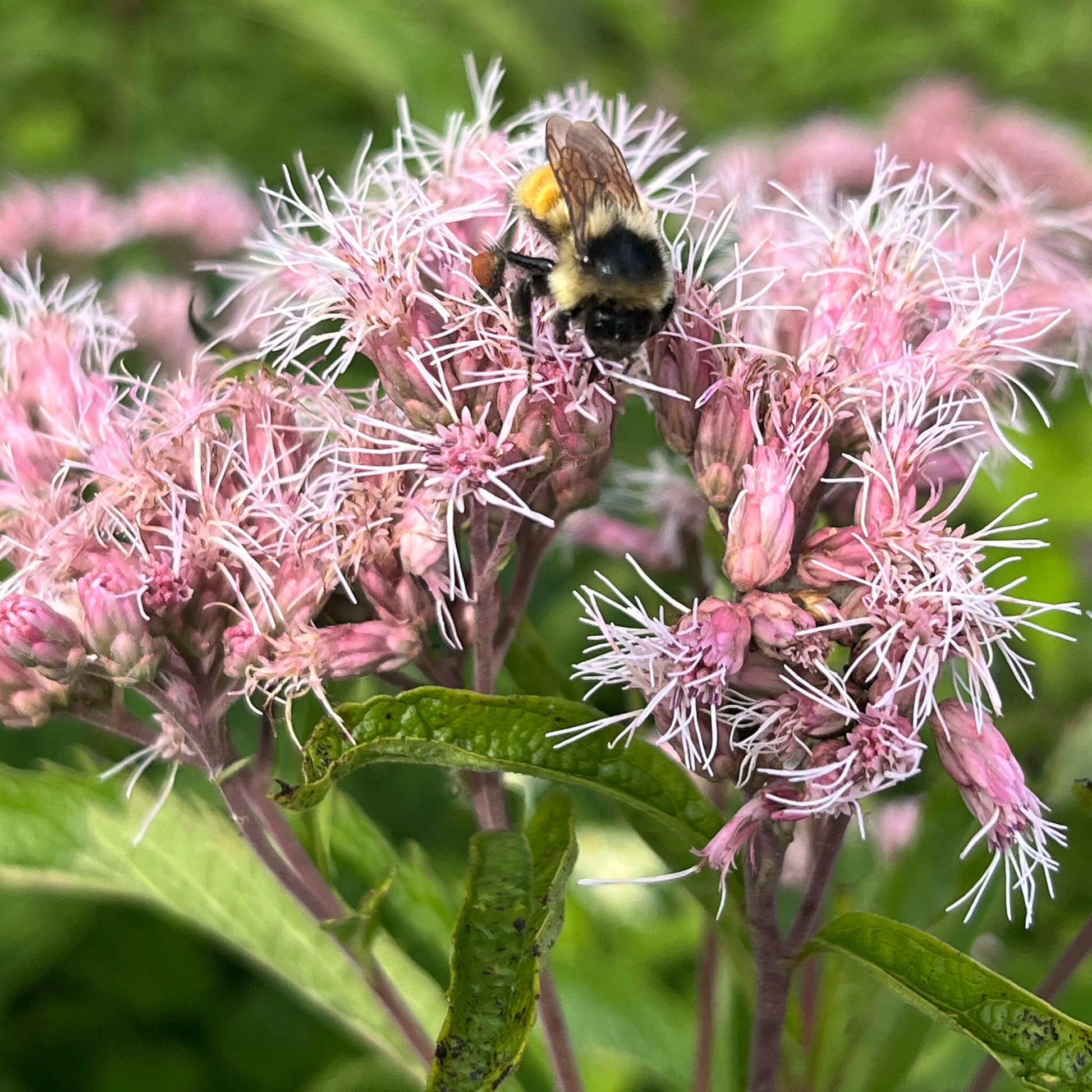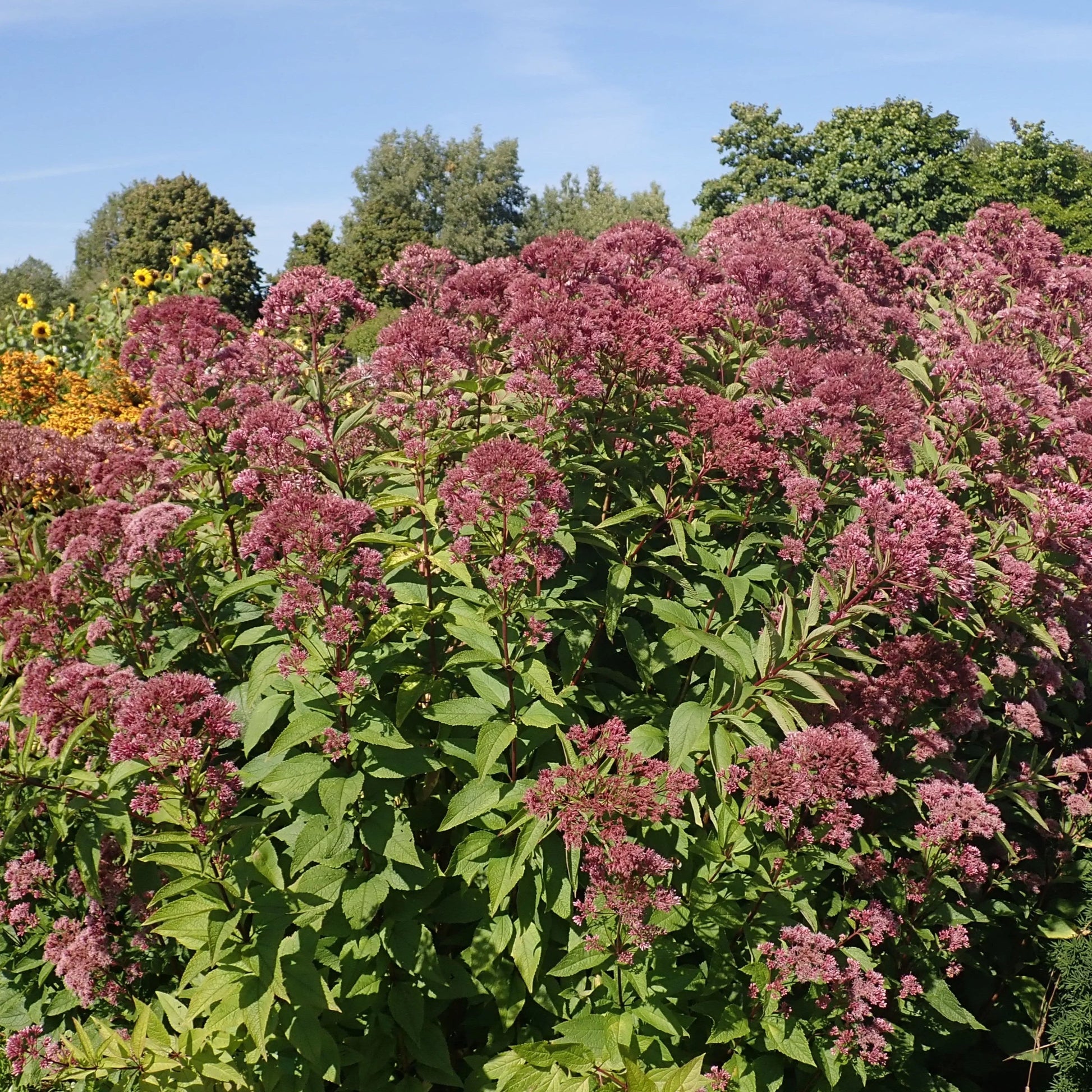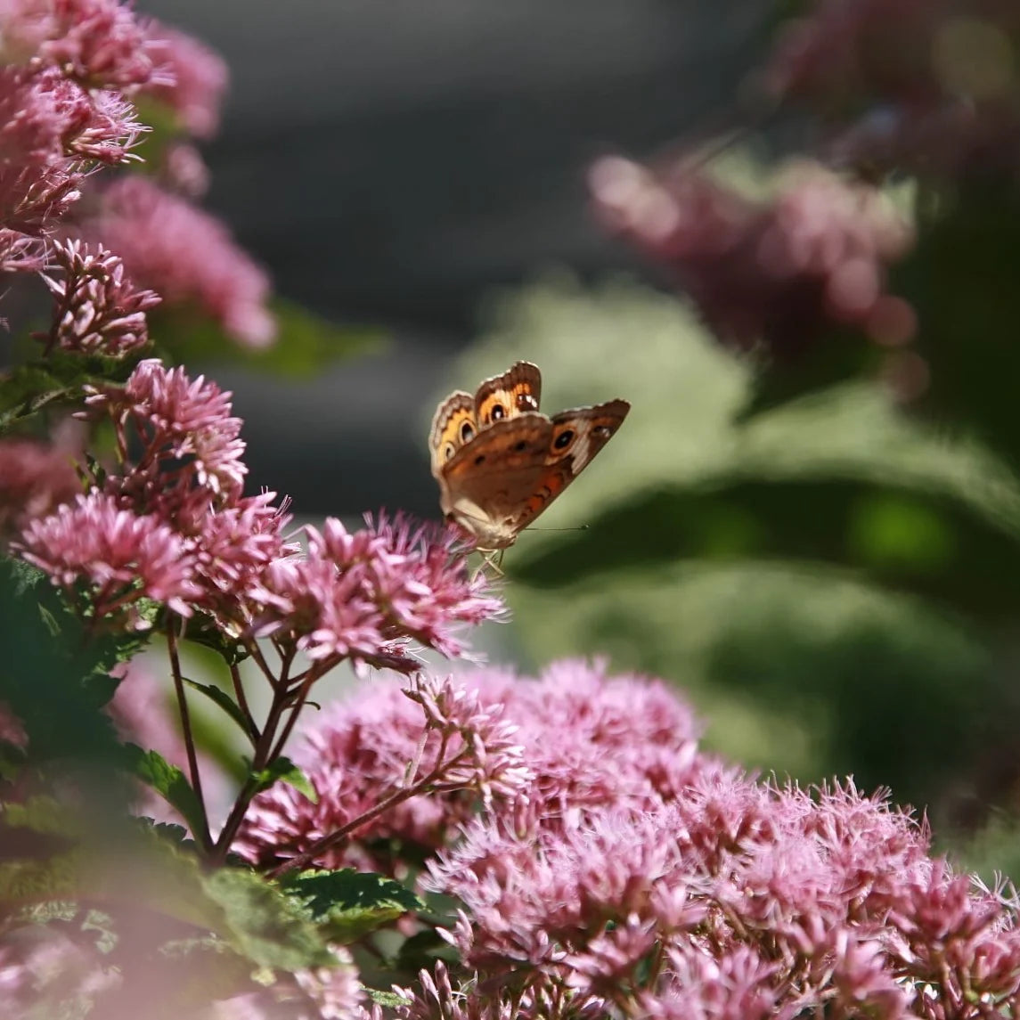 L’eupatoire maculée (Eutrochium maculatum) est une grande plante vivace indigène qui prospère dans les sols frais, humides et même mal drainés, ce qui en fait un choix idéal pour stabiliser et naturaliser les berges, le bord des étangs ou les fossés. Atteignant souvent jusqu'à 1,5 mètre de hauteur, cette plante se distingue par ses tiges droites tachetées et surmontées de grandes grappes de capitules de fleurs roses. En plus de sa robustesse, l’eupatoire maculée est extrêmement attrayante pour les papillons et autres pollinisateurs qui trouvent ses fleurs irrésistibles. Adaptée aux sols riches, elle peut également s'épanouir dans les jardins, apportant une touche de verticalité et de couleur avec ses magnifiques inflorescences.