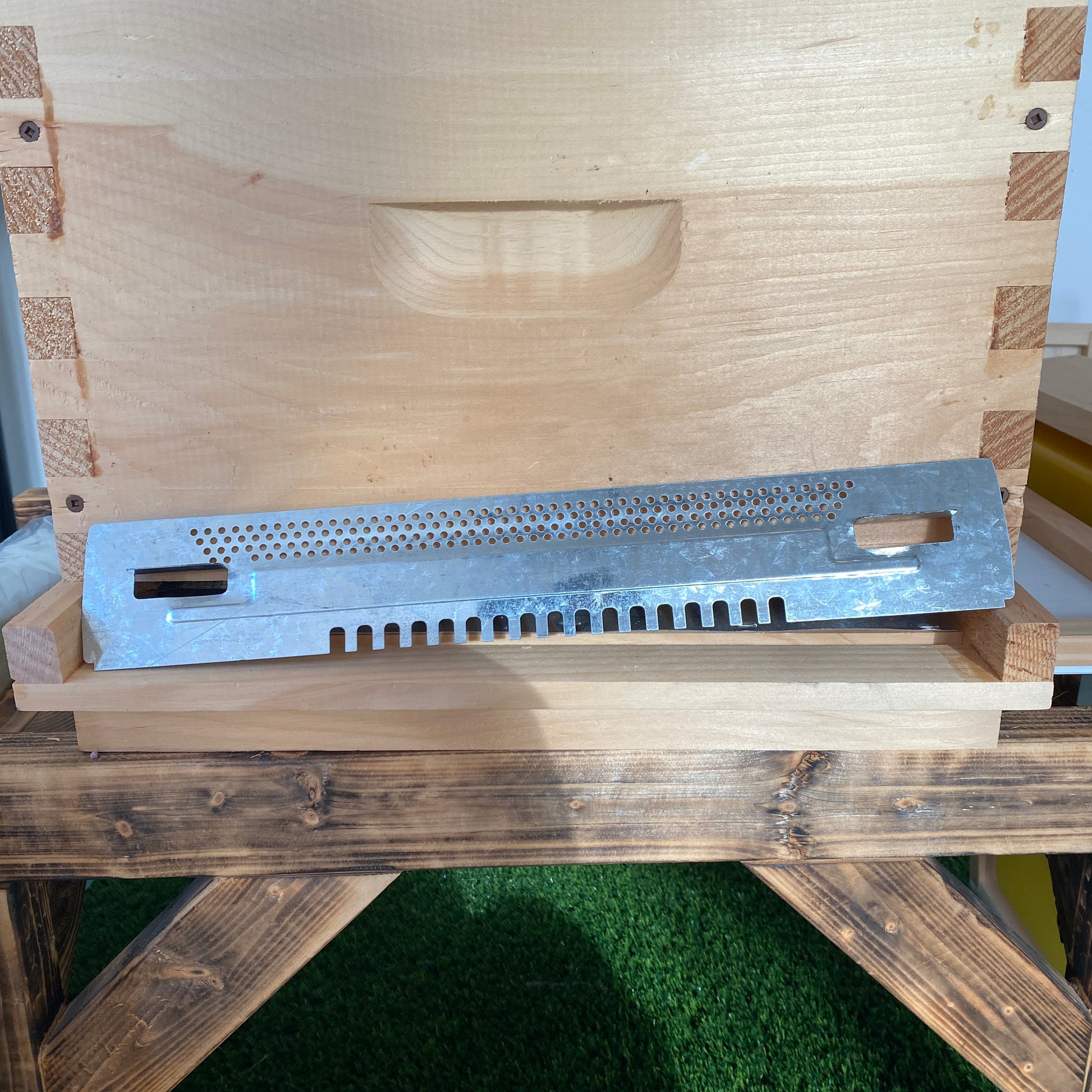Entrée en métal pour éviter l'entrée de souris dans la ruche, surtout pendant l'hiver. On peut le mettre du côté troué pour fermer la ruche lors des déplacements. Longueur de 15 1/4''.